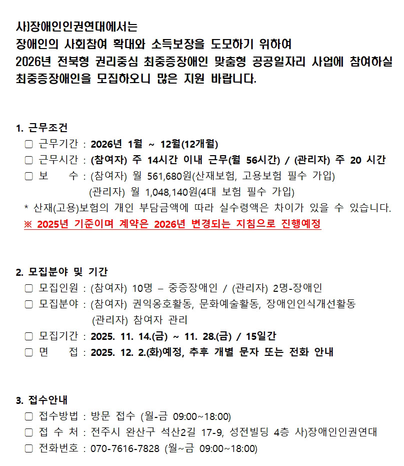 [마감] 2026년 전북형 권리중심 중증장애인 맞춤형 공공일자리 참여자 모집공고
