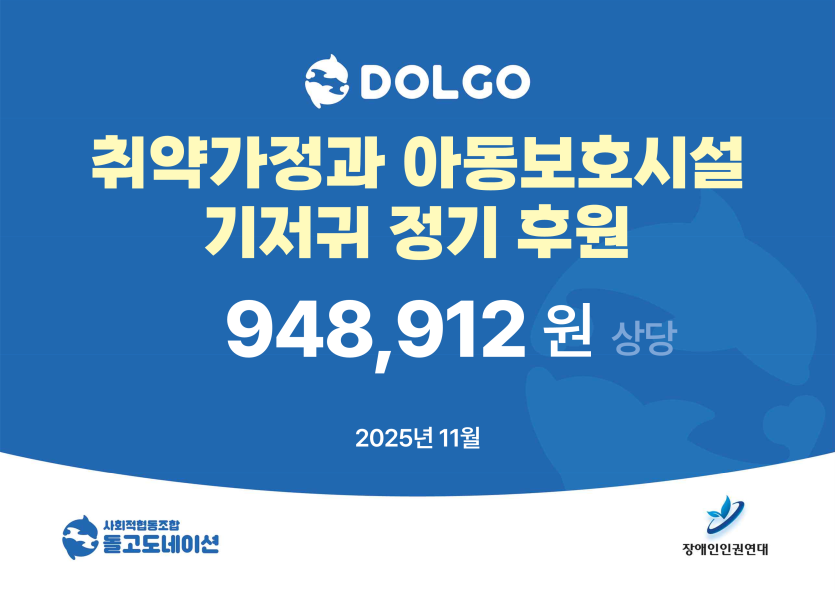 항상 사회의 따뜻한 손길을 전해주시는 돌고도네이션에 깊은 감사를 드리며, 보내주신 마음이 도움이 필요한 이웃들에게 따뜻하게 전달될 수 있도록 앞으로도 정성껏 나눔을 이어가겠습니다.
