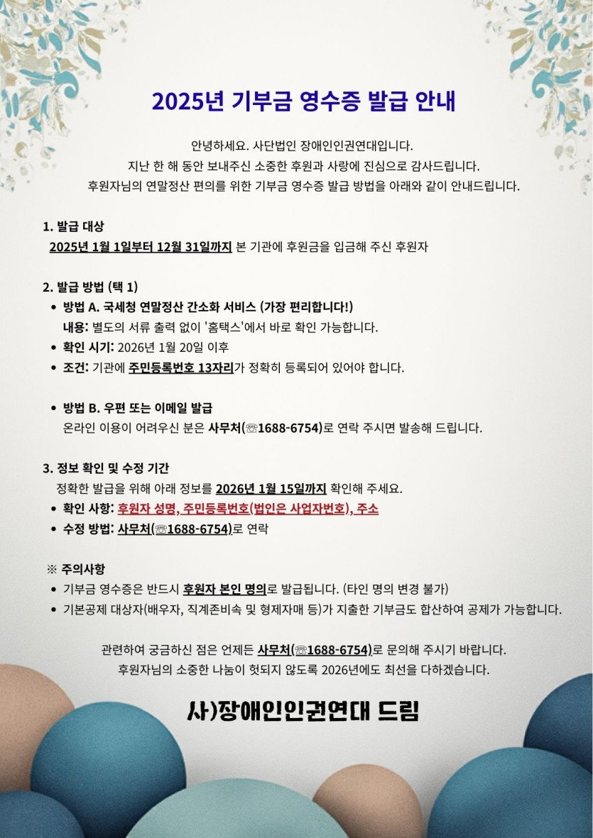 2025년 기부금 영수증 발급 안내 페이지 정보 작성자 장애인인권연대 댓글 댓글 0건 조회Hit 35회 작성일Date 26-01-09 16:57 본문 . 목록 다음글2026년 장애아가족 양육지원사업 장애아돌보미 양성교육 일정안내 26.01.09 댓글 0 댓글목록 등록된 댓글이 없습니다.
